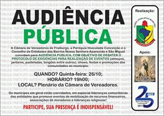 A mesa diretora da Câmara de Vereadores de Fraiburgo, através de seu presidente Gerson de Matia (Cersão), está organizando AUDIÊNCIA PÚBLICA, COM OBJETIVO DE DEBATER O PROTOCOLO DE EXIGÊNCIAS PARA REALIZAÇÃO DE EVENTOS (almoços, jantares, pasteladas, bingões entre outros), shows, festas e promoções das comunidades no município. O pedido para a realização da audiência partiu […]