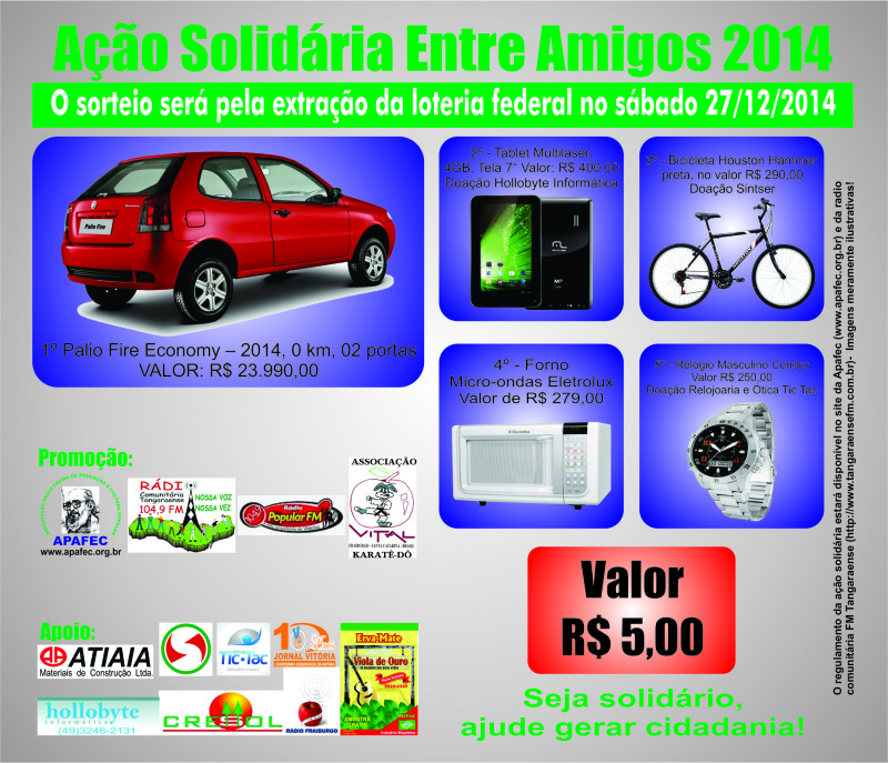 A Apafec e a Associação Vital Fraiburgo de Karatê-dô promovem a 11ª Ação Solidária Entre Amigos, edição 2014! Neste ano são cinco super prêmios: 1º prêmio: Palio Fire Economy 2014 zero km; 2º prêmio: Tablet Multilaser; 3º prêmio: Bicicleta Houston; 4º prêmio: Forno Micro-ondas Eletrolux e o 5º prêmio: Relógio Masculino Condor. Comprando uma cartela […]