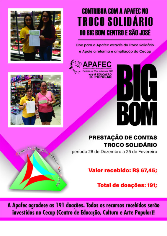 No último dia do mês de fevereiro a Apafec (Associação Paulo Freire de Educação e Cultura Popular) recebeu o 10º (décimo) repasse do Troco Solidário do Big Bom, do período 26 de janeiro a 25 de fevereiro, a entidade freireana foi agraciada com 108 doações da comunidade fraiburguenses, totalizando R$ 39.76 (trinta e nove reais, […]