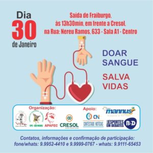 A primeira coleta da Campanha Doar Sangue, Salvar Vidas, acontece no dia 30 de janeiro, em Joaçaba, a saída de Fraiburgo acontece às 13h30min em frente ao Posto de Atendimento da Cresol em Fraiburgo, localizado na Rua: Nereu Ramos, 633 – Sala A1 – Centro.