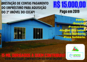 O Cecap (Centro de Educação, Cultura e Arte Popular), teve mais uma importante conquista em 2019, foram pagos mais R$ 15.000,00 (quinze mil reais), do empréstimo para aquisição do segundo imóvel, onde está sendo construindo aos pouquinhos esse espaço destinado a educação, cultura e arte popular. O valor pago teve as seguintes origens: