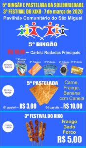 O 5º Bingão e Pastelada da Solidariedade e 3º Festival de Xixo é organizado pelo Conselho Pastoral da Comunidade São Miguel, Associação Hayashi-há Vital de Karatê-dô e Apafec (Associação Paulo Freire de Educação e Cultura Popular), cada entidade investirá os recursos arrecadados em seus projetos e ações.