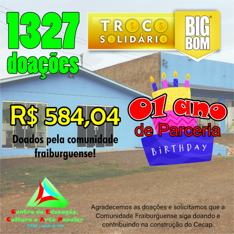 Nos últimos 12 meses a Comunidade de Fraiburgo realizou 1327 (mil trezentas e vinte e sete) doações ao Cecap, através do Troco Solidário do Big Bom, totalizando R$ 584,04 (quinhentos e oitenta e quatro reais, com quatro centavos) arrecadados, valores utilizados no pagamento do empréstimo para aquisição do segundo imóvel onde está sendo construindo o […]