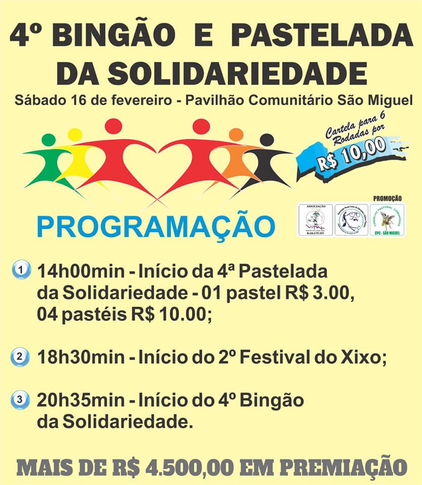 No sábado 16 de fevereiro, o Conselho Pastoral da Comunidade São Miguel, a Associação Hayashi-ha Vital Fraiburgo de Karatê-dô e a Associação Paulo Freire de Educação e Cultura Popular (Apafec) promovem a 4ª Edição do Bingão e Pastelada da Solidariedade. As 14h00min terá inicio a Pastelada, um pastel a R$ 3.00, e 04 pasteis por […]