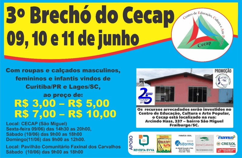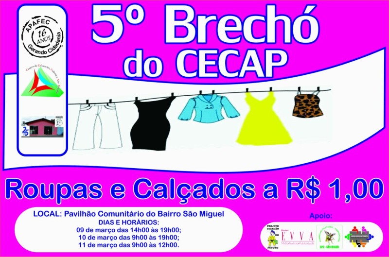 O 5º Brechó do Cecap (Centro de Educação, Cultura e Arte Popular) será realizado nos dias 9, 10 e 11 de março no Pavilhão Comunitário São Miguel. As roupas, calçados e acessórios serão comercializadas por R$ 1,00. Os recursos arrecadados com essa ação serão investidos em melhorias no Cecap, localizado na rua Arcindo Hass, 337, […]