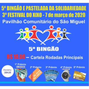 A 5ª Edição do Bingão e Pastelada da Solidariedade e a 3ª Edição do Festival de Xixo, acontece no dia 07 de março, no Pavilhão Comunitário São Miguel. Com a seguinte programação: