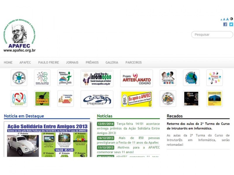A Apafec (Associação Paulo Freire de Educação e Cultura Popular), lança no próximo dia 14/01, juntamente com a entrega dos prêmios da Ação Solidária Entre Amigos 2013, o novo layout de seu portal na internet. O evento acontecerá, às 20h30min, no Dojô Cidadão do Futuro, situado na rua Angelim Grigolo, s/nº, bairro São Miguel