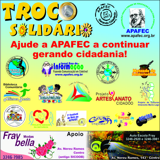 A Auto Escola Fray e a Fray Bella Modas, doaram na quarta-feira (09/07), R$ 375,00 (trezentos e setenta e cinco reais) para a Apafec (Associação Paulo Freire de Educação e Cultura Popular), a quantia será utilizada na implantação do Projeto Troco Solidário. Esse projeto visa estimular a doação do troco da compra para a Apafec, o montante arrecadado com o troco solidário será aplicado nos projetos, ações e atividades de educação e organização popular, desenvolvidas pela entidade há quase 12 anos.