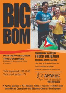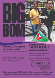 Clientes do Supermercado Big Bom Centro e São José, são estimulados a fazerem doações dos centavos que sobram de suas compras, a Apafec (Associação Paulo Freire de Educação e Cultura Popular), é um das instituições que podem ser beneficiada com as doações do Troco Solidário.