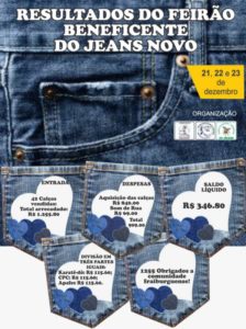 Sobrou R$ 346.80 (trezentos e quarenta e seis reais, com oitenta centavos), os quais foram divididos em três partes iguais de R$ 115.60 (cento e quinze reais, com sessenta centavos), a serem investidos nos projetos e ações de cada instituição envolvida na organização do 1º Feirão Beneficente do Jeans Novo.