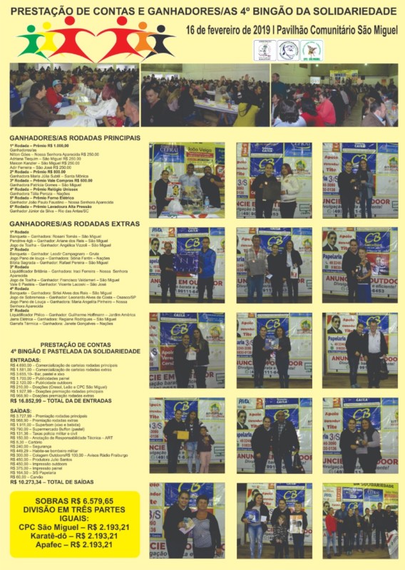 O Conselho Pastoral da Comunidade São Miguel, a Associação Hayashi-ha Vital Fraiburgo de Karatê-dô e a Associação Paulo Freire de Educação e Cultura Popular (Apafec), realizaram no dia 16 de fevereiro o 4º Bingão e Pastelada da Solidariedade, no Pavilhão Comunitário São Miguel.